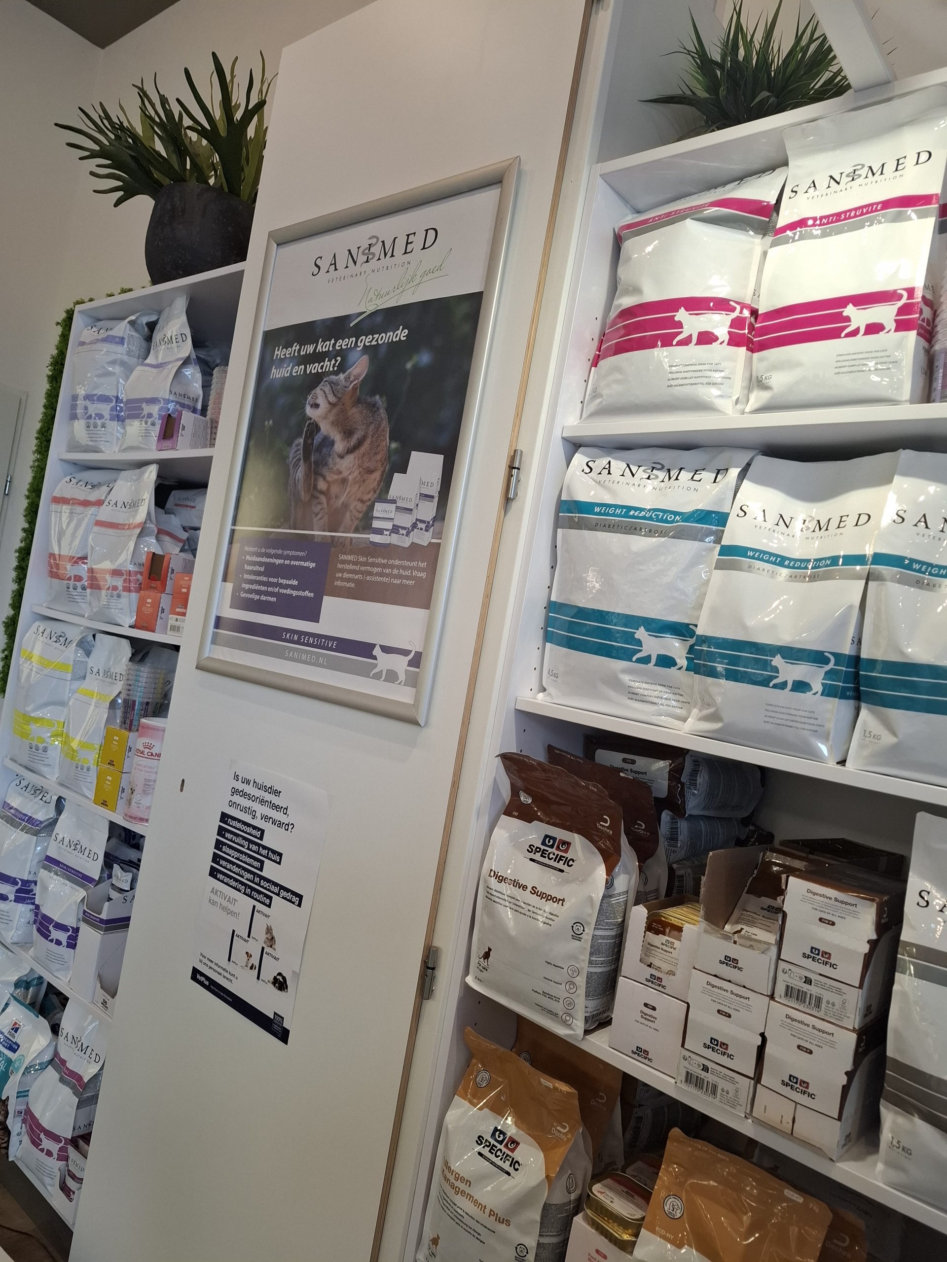 In de wachtkamer hebben we 2 voerstellingen. Een voor de honden en een voor de katten. Een ruim assortiment met verschillende dieetvoedingen voor uw huisdier.